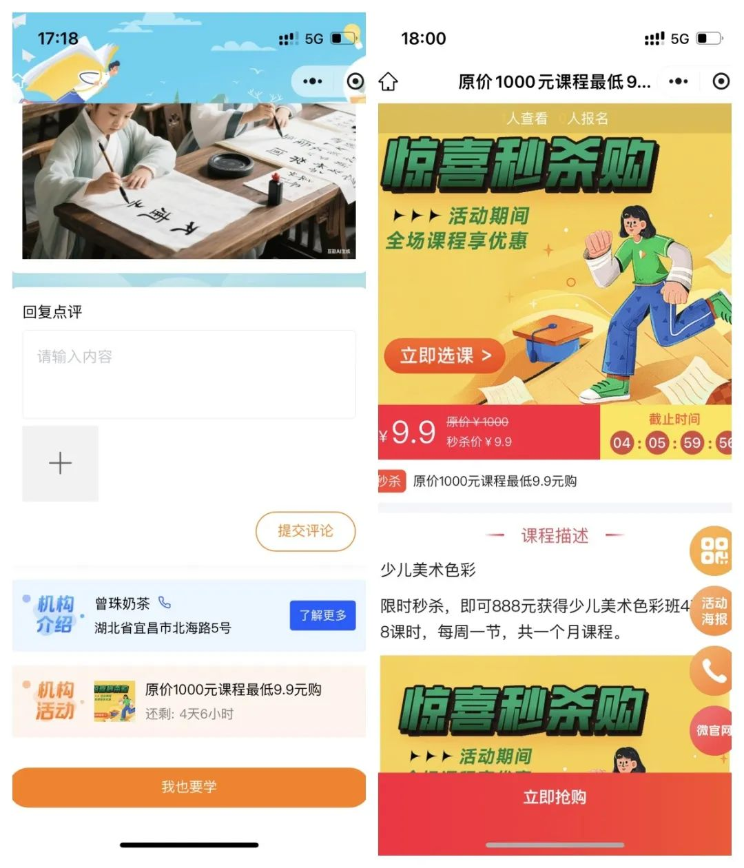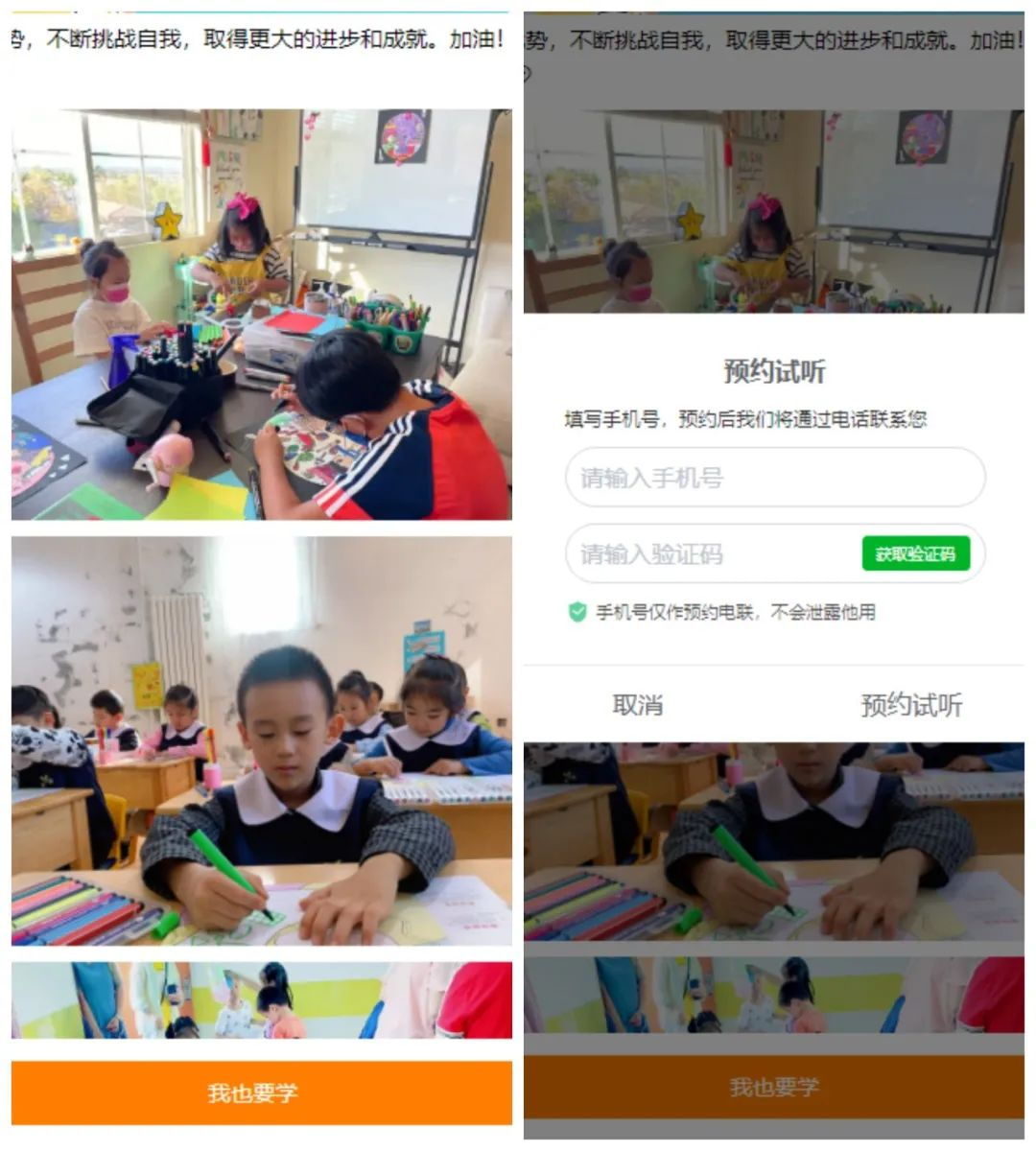 顺带我们也可以附加一个试听活动入口,让心动的家长可以直接进行报名试听,同时也可以避免正式报名后效果不好的尴尬。