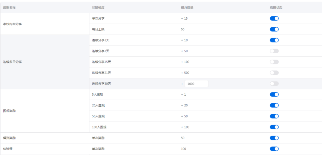更重要的是,我们可以就家长分享的过程给予积分奖励,例如有5人观看了可以给予10个积分奖励这种,分享一次奖励2个积分等等。