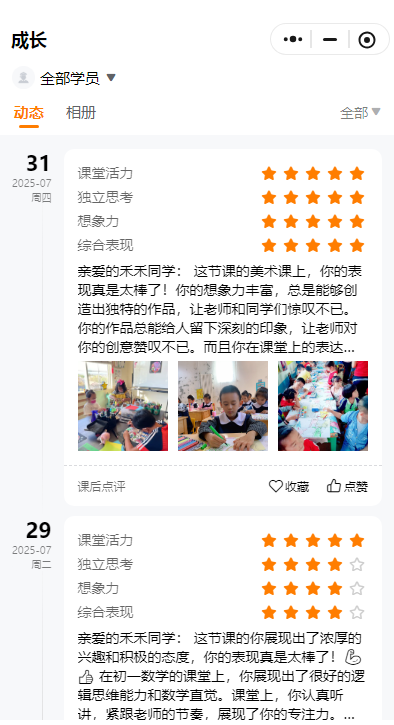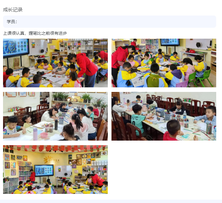 档案中的文字内容可以覆盖课堂内容介绍,孩子成长点,成长点评等等。
