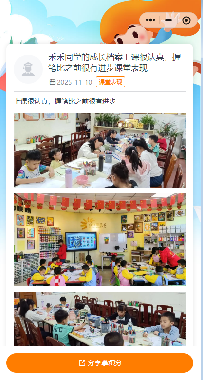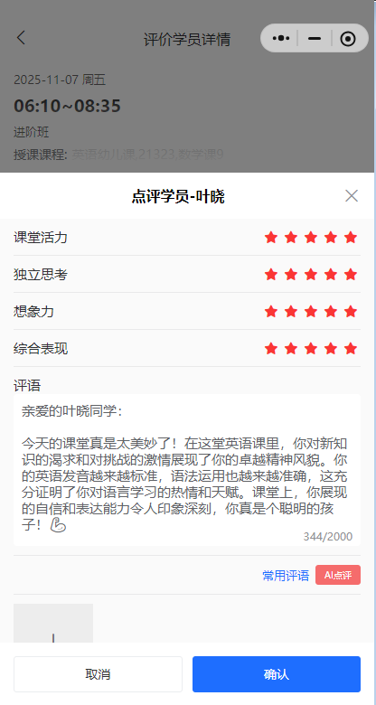 这里的反馈不单单是,老师写一两句评语,“今天孩子很努力”这样的大话空话,我们要把孩子的实际表现做成照片或者视频进行反馈,搭配上AI点评,让点评能够更高效,更有调理,同时反馈的效果更加明显。
