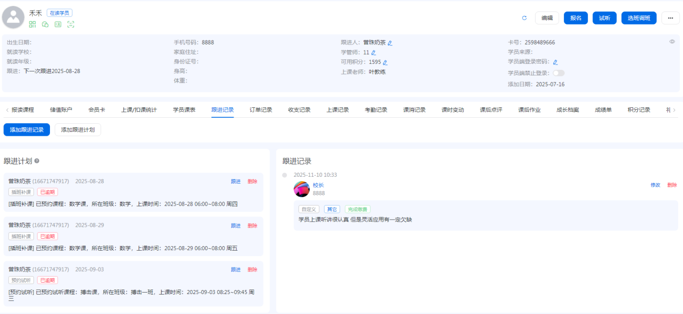 当学员在读一段时间后,我们可以就学员的历史课程,学习表现,进入考勤情况等等对学员进行一个全面的学情分析,创建一个专属的跟进记录,让老师和家长沟通更及时,更专业,同时在后续谈论续费问题时更自然。