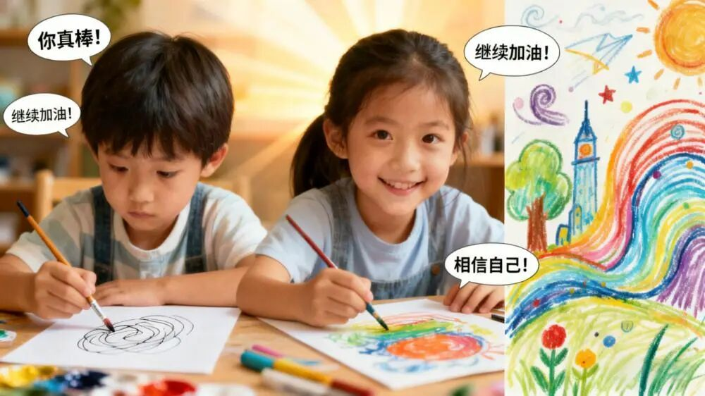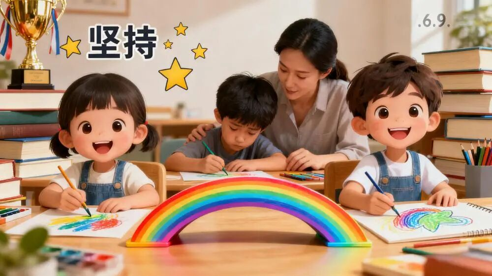其实艺术类的学习更像是语文这门学科,需要循序渐进的积累,厚积而薄发,不像是数学,学一个公式就能套用,从而答对问题。所以艺术类的学习效果不能只通过孩子的画面表现来判断,但其实在我看来孩子还是有不少的进步的,比如性格开朗了,兴趣也激发了,变得更自信了,上课习惯也好了。这些变化是一个慢慢积累的过程,最终积攒到了一定量的时候,就会反映在孩子的作品中以及日常生活动。学习就像煮开水,只有前面默默坚持完前面的99度打下了好的基础,才会迎来第100度的沸腾。所以作为家长和老师,要多发现孩子各方面的进步,不断鼓励,更不能轻易放弃,这样才是真正对孩子的教育负责。(之后可以举一些其他学员的成长案例)