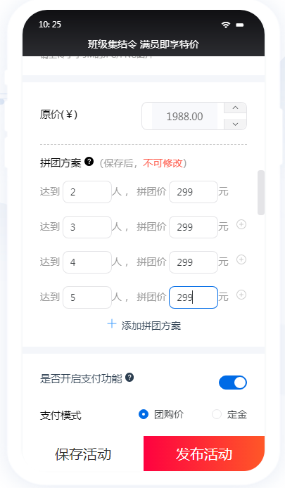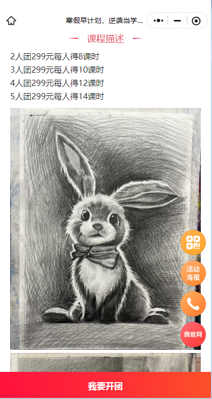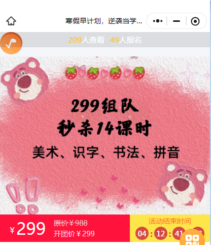机构决定借助双十二这个时间节点,开展名为“299组队秒杀14课时”的团购活动,并提前在朋友圈,社交圈进行预热,当活动开启后的当天就获得了200多人的关注,将近50名学员直接报名缴费