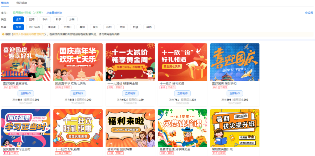 小禾帮系统支持制作各种招生活动,还可指定活动跟进人,让老师在推广时更有动力,学员报名归属更科学,助力机构招生更容易。