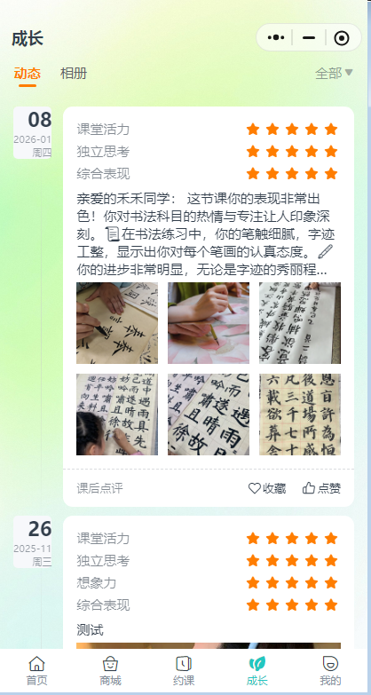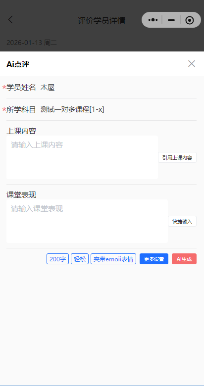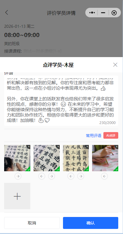 AI通过关键词可以快速生成对应的点评,老师可进行修改,或者上传上课图片,视频等等