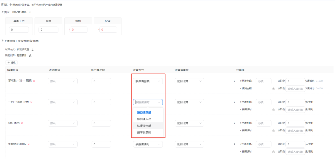 小禾帮支持多种不同的绩效工资计算方式,在寒假期间我们可以将老师的提成与课消相挂钩,以此刺激机构老师的上课积极性