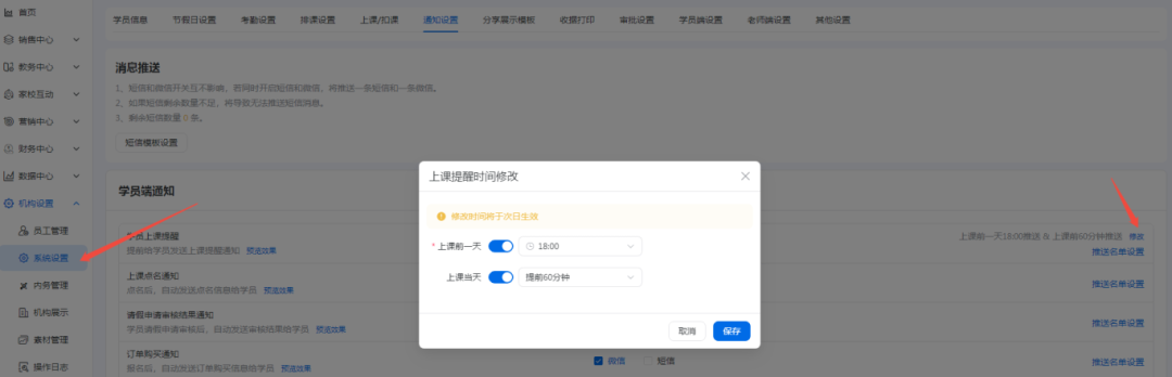 寒假不同于平常时期上课,机构往往会调整上课时间,所以我们需要做好课前提醒功能;
