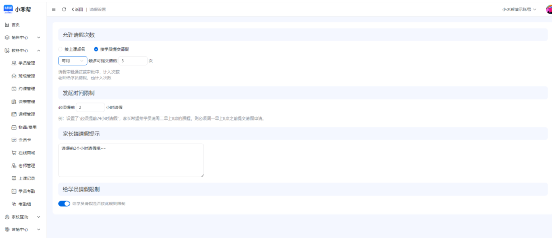 寒假期间也是学员请假的高峰期,一定要设置好请假规则,当家长请假次数超过最大限制时,系统自动关闭学员请假功能,确保课程进度不会受到任何影响。