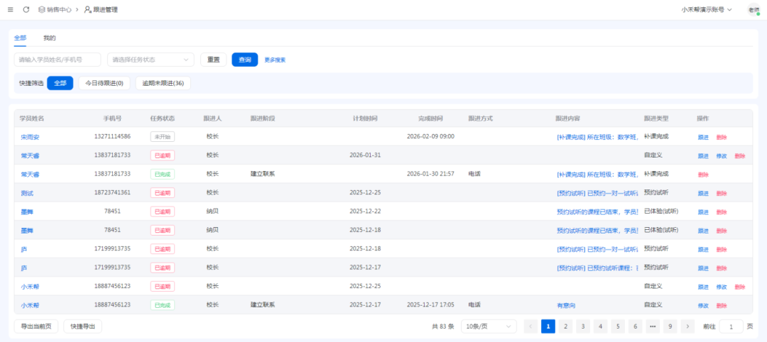 小禾帮教务系统:为每一条线索建立完整跟进档案,信息随时可查、试听一键邀约,