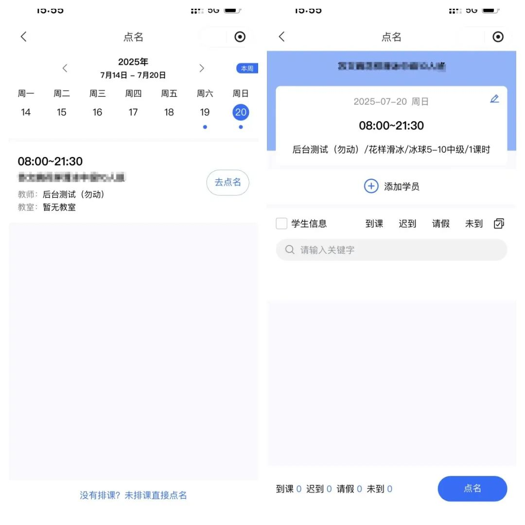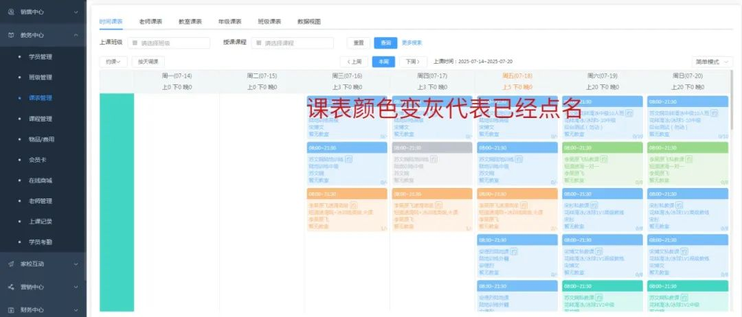 2.前台只需通过课表颜色变化来判断教练是否点名