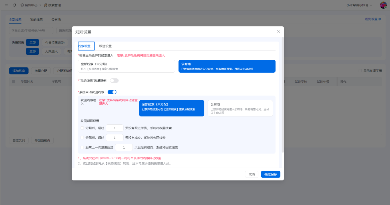 借助线索管理设置,可对哪些长期未跟进或者未成功转化的线索重新落入公有池,其他老师可以再次进行跟进,同时,线索管理页面也可以看到每一个线索的跟进情况,大大节省了销售人员汇报进度的时间,有更多的时间可以更好的进行线索转化。