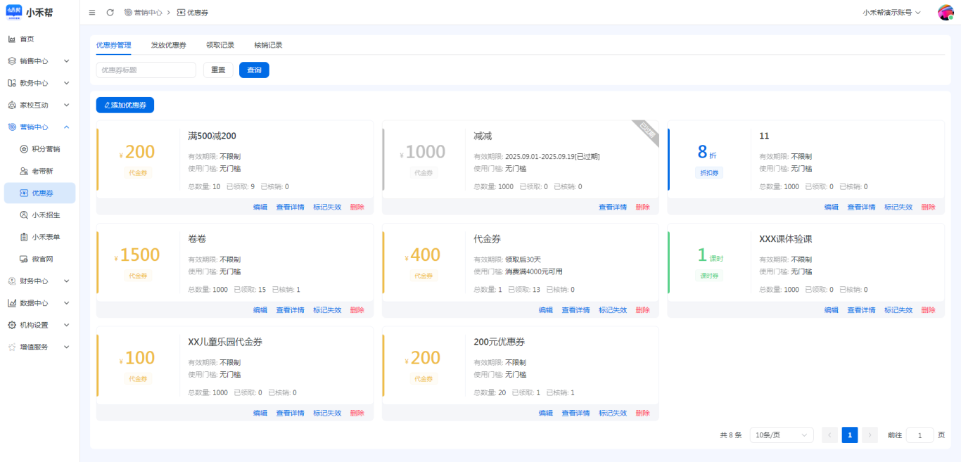 简单直白的优惠方式,永远是深得家长心意,通过小禾帮也可以快速实现优惠券的发放,家长直接,优惠券;折扣券;课时券,家长可以任意选择,直接发放到学生固定账户中,报名时可以直接进行使用。