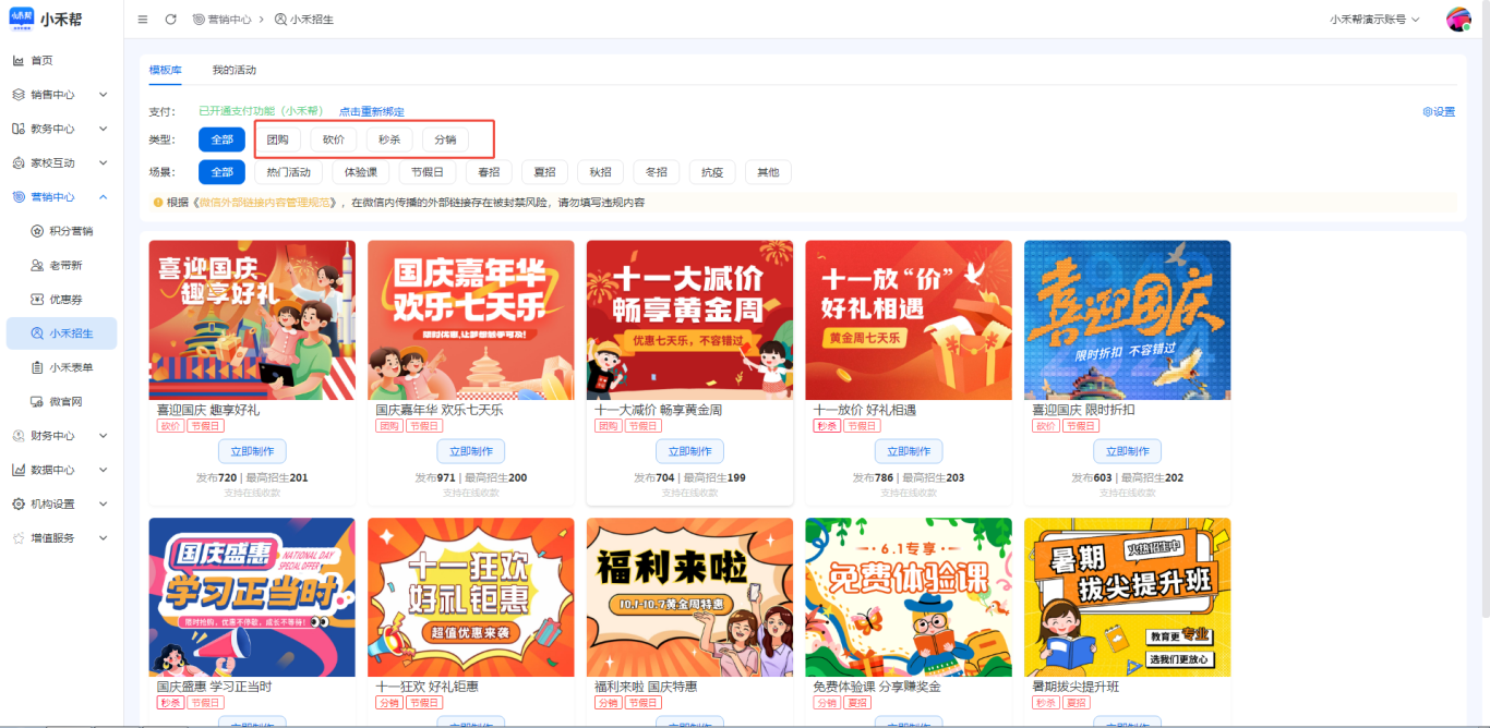 机构根据自己的实际情况去选择合适的模板,开启双十一招生活动,通过家长群,朋友圈等社交媒体实现快速裂变,触达更多的家长学生。