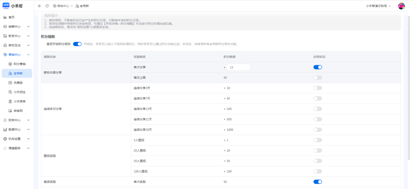 强烈建议还没有开启积分营销这一块的机构在双十一阶段进行启用,将转介绍与积分相结合,成功介绍新学员报名可获得500积分,后期通过积分可以兑换各种自己喜欢的礼品。