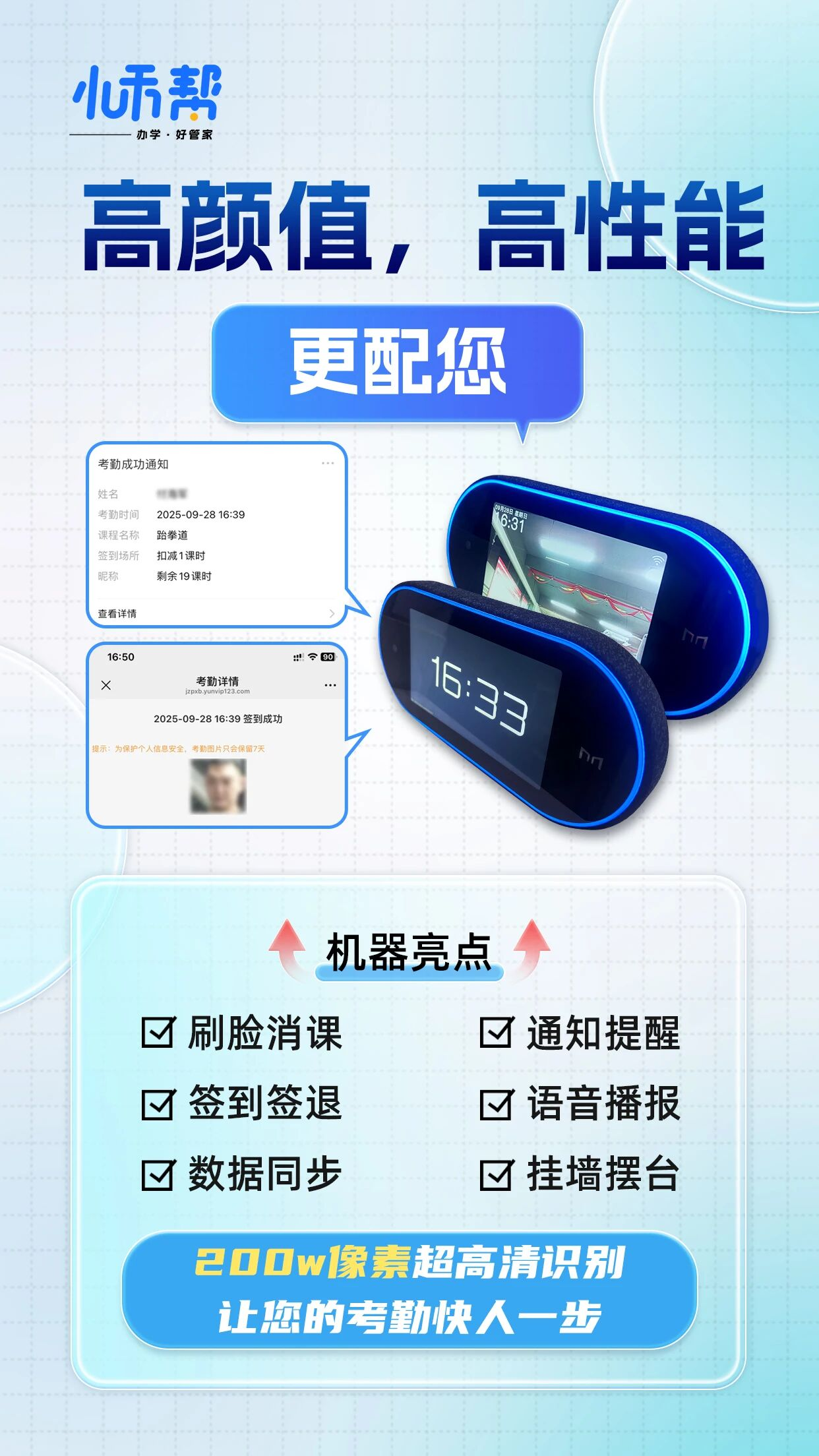 小禾帮为进一步帮助各机构提高考勤效率,特意对接了全新的智能人脸识别设备——魔点MOS305