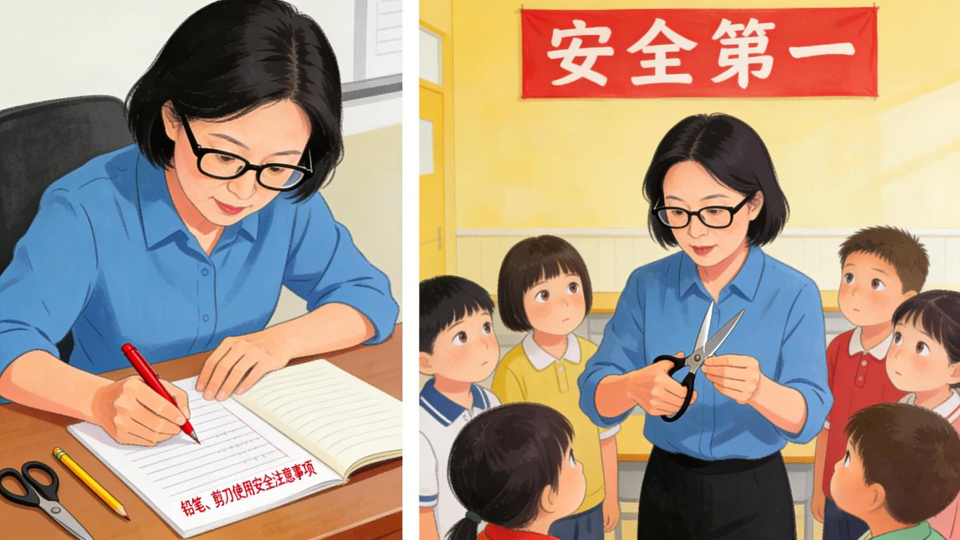在老师设置和推出一个全新教学活动时,要充分考虑到每个环节中可能出现的意外,尤其是涉及低龄儿童需要使用铅笔,剪刀这些尖锐物品时。