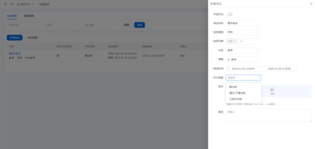 若考试成绩想要以分数方式呈现则选择【赋分制】;若只显示是否考试通过则选择【通过/不通过制】;若想以等级显示则选择【三级评分制】