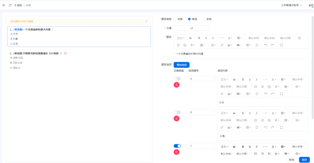 通过小禾帮系统,老师可直接上传考试题目,制作在线考试,发布到学员端,学员直接点击进入即可开始考试